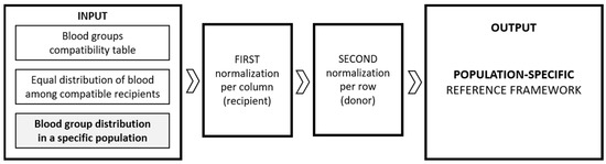 Starting points for the construction of our general mathematical model are the universal blood compatibility chart, which will be described in detail in Section 2.1, and the mathematical technique of sum normalization, briefly presented in Section 2.2. In Section 2.3, we provide necessary details about the naturally occurring differences in blood type distributions in national and ethnic populations, specifically for the Bulgarian population as our chosen object of research, as this specific distribution is a key input parameter that not only elaborates our general mathematical model but makes it practically applicable in a particular context for decision making and efficient healthcare management.
