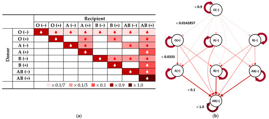 Donor/recipient compatibility table with applied prioritization of ABO-identical transfusions: (a) in tabular form with applied conditional formatting according to the colour legend; (b) in the form of a weighted directed graph with weight coefficients adjacent to sample arcs.