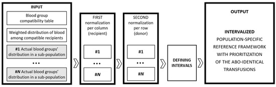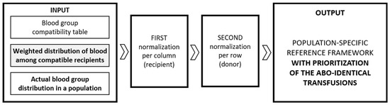In this section, we walk the reader through our three-step model, paying particular attention to the updated first step, where the model obtains as an additional input the blood group distributions of the Bulgarian population. The general model [12] can be schematically represented by Figure 3.