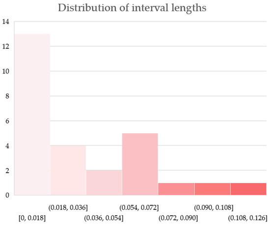 A histogram of the distribution of interval lengths is established and presented in Figure 8. Three of the most popular methods of determining the number of histogram bins are the square-root choice, Sturges’s formula, and Rice rule, which suggest that for our number of data points n = 27, the optimal number of bins is k = 6; according to Terrell–Scott rule, k = 4; according to Scott’s normal reference rule, k = 5; and according to Doane’s formula, k = 7. We choose the seven-bin histogram representation, as it best reflects the clusters of values and the gaps in between.