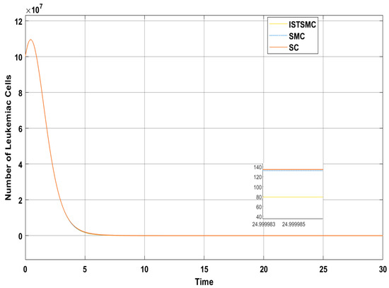 Figure 6 presents a comparative analysis of the proposed controllers (ISTSMC, SMC, and SC) with respect to the state , representing the number of leukemic cells. The results indicate that ISTSMC reduces leukemic cell levels to significantly faster than SMC and SC. Furthermore, at the end of therapy, the normal cell count remains above the minimum safe threshold .