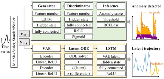 Figure 5b, the proposed LSTM+latent ODE (VAE) model showed the most accurate predictions. For anomaly detection models, the AUC values were close to 0.5, indicating a need for further performance improvement. However, no significant issues were observed when visualizing anomaly detection and classification results.