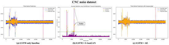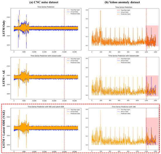 Figure 5a, the LSTM+latent ODE model, which was responsible for predictive maintenance based on noise data from manufacturing equipment (CNC Noise Dataset), was used to process time series data. The X-axis (time) represents the flow of time in the data, and the prediction model learned and evaluated the data along the time axis. The Y-axis (value) shows the normalized or scaled sound intensity of the recorded sound data from the equipment. The blue line (actual data) represents the actual sound data collected, which served as the reference data for model training and evaluation. The orange line (predicted data) shows the values predicted by the model, which were compared to the actual data to assess the model’s performance. The red vertical line (train/test split) indicates the point where the dataset was divided into training and testing sets. To the left of that line are the data the model learned from, while the right side comprises data that the model had not seen before.