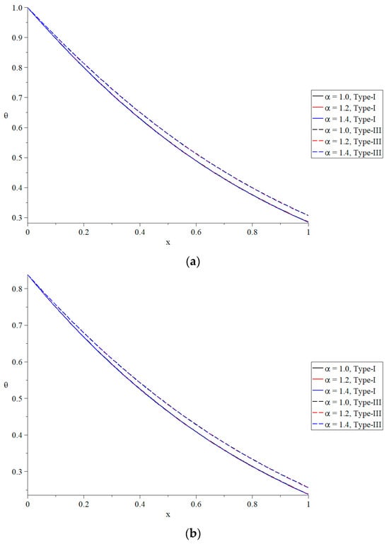 The temperature increment distribution under different values of the time-fractional parameter of Maxwell’s equations. (a) The distribution of the temperature increment based on Green–Naghdi type-I and type-III when . (b) The distribution of the temperature increment based on Green–Naghdi type-I and type-III when .