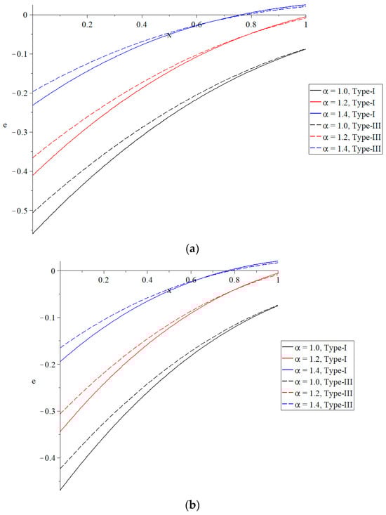 The distribution of volumetric dilatation under different values of the time-fractional parameter of Maxwell’s equations. (a) The distribution of volumetric dilatation based on Green–Naghdi type-I and type-III when . (b) The distribution of volumetric dilatation based on Green–Naghdi type-I and type-III when .