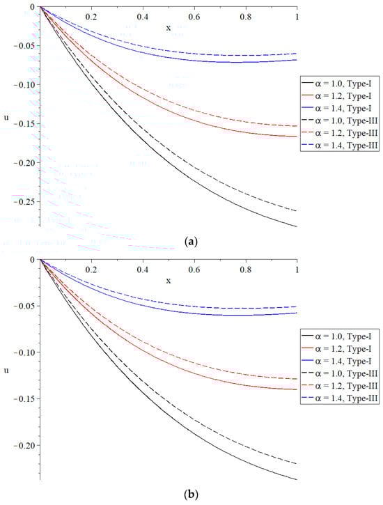 The distribution of displacement under different values of the time-fractional parameter of Maxwell’s equations. (a) The distribution of displacement based on Green–Naghdi type-I and type-III when . (b) The distribution of displacement based on Green–Naghdi type-I and type-III when .