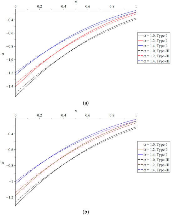 The distribution of stress under different values of the time-fractional parameter of Max-well’s equations. (a) The distribution of stress based on Green–Naghdi type-I and type-III when . (b) The distribution of stress based on Green–Naghdi type-I and type-III when .