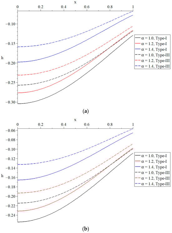The distribution of induced magnetic field under different values of the time-fractional parameter of Maxwell’s equations. (a) The distribution of the induced magnetic field based on Green–Naghdi type-I and type-III . (b) The distribution of the induced magnetic field based on Green–Naghdi type-I and type-III when .