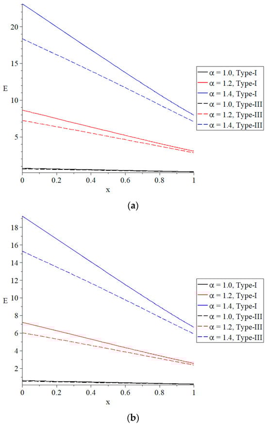 The distribution of the induced electric field under different values of the time-fractional parameter of Maxwell’s equations. (a) The distribution of the induced electric field based on Green–Naghdi type-I and type-III when . (b) The distribution of the induced electric field based on Green–Naghdi type-I and type-III when .