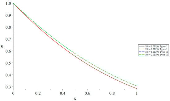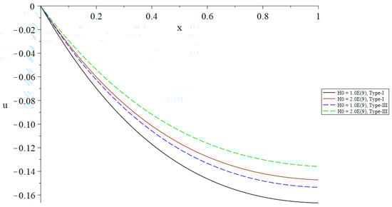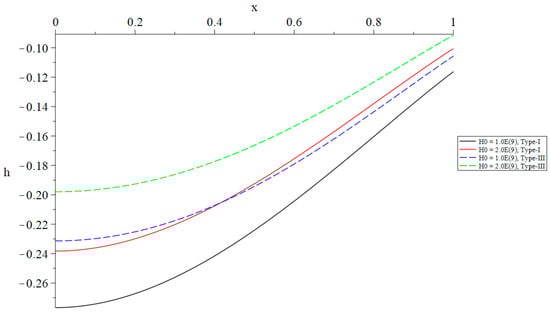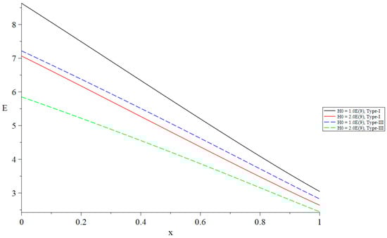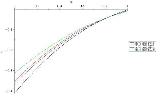 Figure 8, Figure 9, Figure 10, Figure 11, Figure 12 and Figure 13 show the distributions of the temperature increment, the volumetric dilatation, displacement, stress, induced magnetic field, and induced electric field based on Green–Naghdi type-I and type-III, respectively, under the definition of the fractional-order derivative of Caputo when with different values of the primary magnetic field .