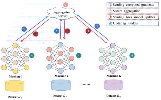 - Bonawitz, K.; Ivanov, V.; Kreuter, B.; Marcedone, A.; McMahan, H.B.; Patel, S.; Ramage, D.; Segal, A.; Seth, K. Practical Secure Aggregation for Privacy-Preserving Machine Learning. In Proceedings of the 2017 ACM SIGSAC Conference on Computer and Communications Security, Dallas, TX, USA, 30 October–3 November 2017; pp. 1132–1147. [Google Scholar]