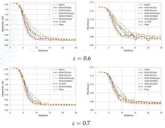 Under different privacy budgets ( = 0.6, 0.7, 0.8, 0.9, 1.0), Integrated Negative Log-Likelihood and Brier Score for Cox-MLP (Nopd) algorithm, LS-ADP algorithm, and ROW-DP algorithm based on five discrete degree measurement methods (Var, Range, Std, MAE, IQR).