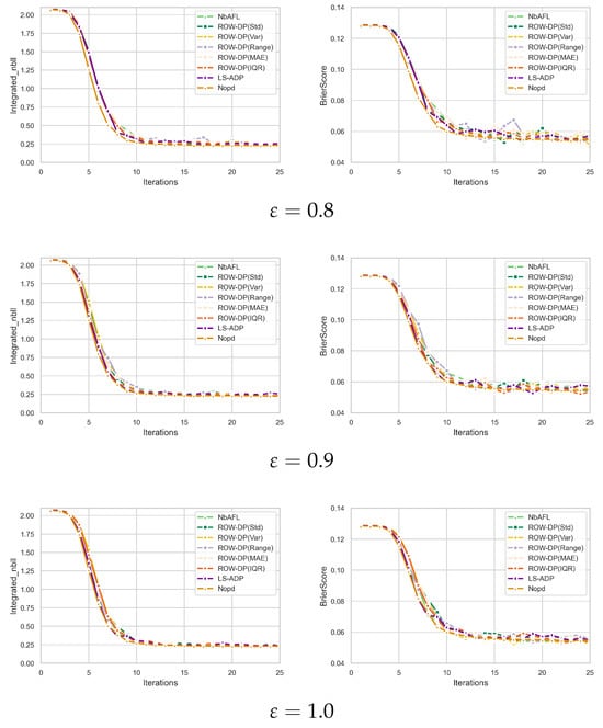Brier Score log-likelihood for Cox-MLP(Nopd), LS-ADP, and ROW-DP algorithms under different privacy budgets () based on five dispersion measurement methods (Var, Range, Std, MAE, IQR).