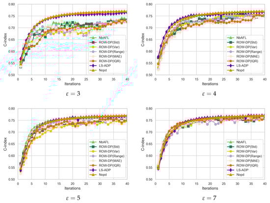 C-index log-likelihood for Cox-MLP(Nopd), LS-ADP, and ROW-DP algorithms under different privacy budgets () based on five dispersion measurement methods (Var, Range, Std, MAE, IQR).