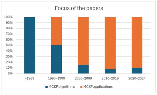 We aim to present versatile solution algorithms and a wide range of application areas of the problem. We examine where MCKP is applied and which algorithms are used to solve the problem. Our research methodology involves data acquisition and systematic literature evaluation. Several repositories were considered as sources of scientometric data for the current paper. We searched databases for the papers with the term “multiple-choice knapsack problem” published in 2024. Google Scholar, Web of Science (WoS), Scopus, and ScienceDirect returned 3090, 114, 249, and 356 hits, respectively. Google Scholar performed a full-text search, while the other repositories looked for the term in the publications’ title, abstract, and keywords. We selected Web of Science as the data source for our review to focus on the most relevant papers and keep the amount of included papers manageable.