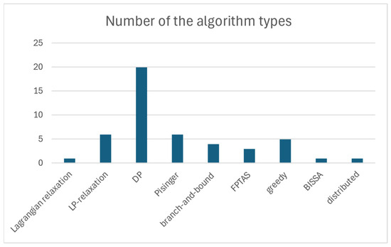 Several algorithms have been developed to solve the problem. Many of them are known from the solution methods of the Knapsack Problem (e.g., dynamic programming, greedy) but there are methods specific to the MCKP (e.g., Pisinger’s Minimal Algorithm, Bi-objective Approximate Solution Search Algorithm). See Section 5 for an overview of the solution methods for the MCKP. The dynamic programming method is the most popular algorithm to solve the MCKP.