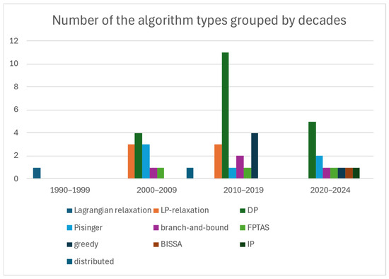 Despite its name, the problem has various applications, including manufacturing, logistics, and solving other combinatorial optimization problems. Pisinger [20] demonstrated that dynamic programming can transform the problem into an equivalent MCKP. The transformation leads to a drastic increase in the number of variables. For this reason, he proposed a more efficient algorithm based on Dantzig–Wolfe decomposition. The master problem solves a continuous MCKP, while the subproblems are optimized using a median search algorithm. The integer optimal solution is derived by applying the dynamic programming transformation to MCKP for an expanding core.