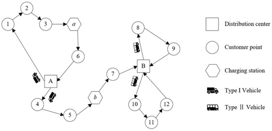 Based on the above problem description and assumptions, the type of urban logistics distribution model proposed in this paper is depicted in Figure 1.