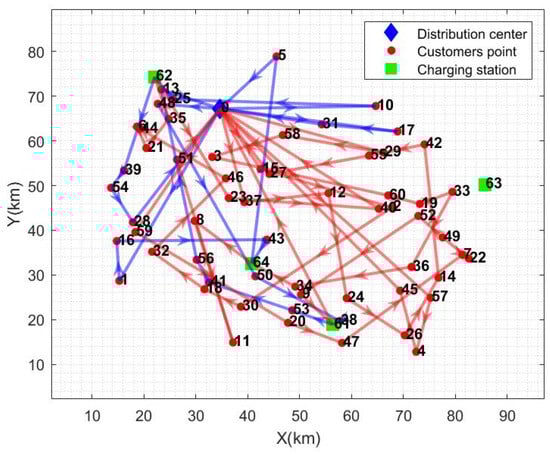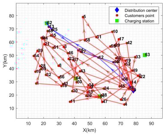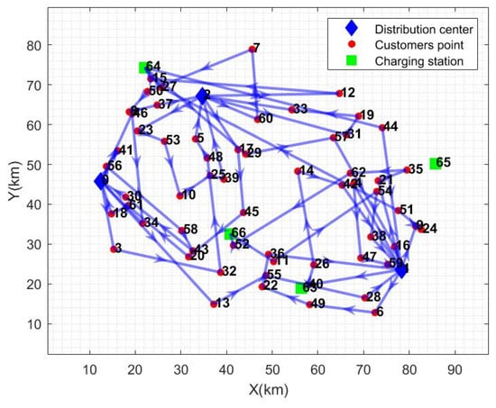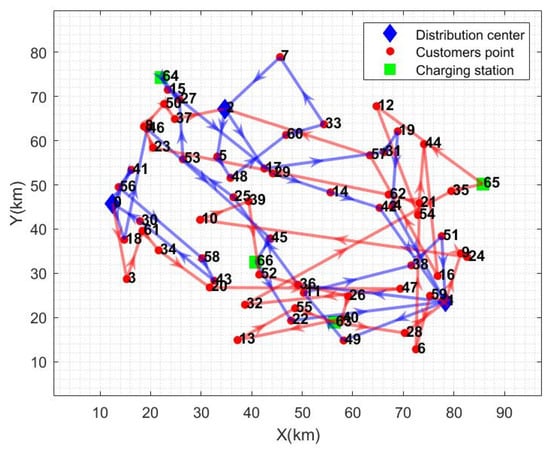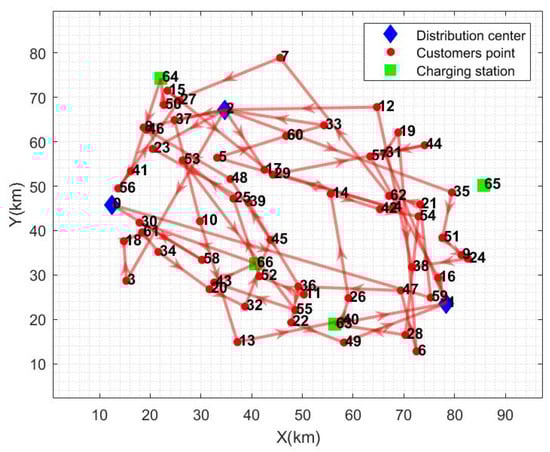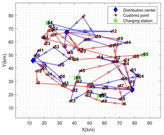 From the calculation results in Table 6, it can be seen that the total cost of distribution has been reduced by an average of 20.44% and the distance of distribution has been reduced by an average of 32.19% compared to the other distribution modes. Electricity consumption is reduced by 18.95% on average, and total distribution time is reduced by 52.53% on average. The path diagrams under the other three distribution modes are given in Figure 5, Figure 6 and Figure 7. As can be seen in Figure 5, the multi-center closed distribution mode requires that the vehicle must return to the original distribution center and the vehicle frequently travels back and forth to the same distribution center, which increases the total cost of distribution, the distribution distance, the electric energy consumption, and the total time of distribution. In Figure 5, when the vehicle completes the delivery of customer point 5, it is closest to distribution center 2; however, the vehicle goes to charging station 64 to recharge and then returns to distribution center 1, which is the furthest distance away. In addition, under the single distribution center model, it is difficult to cover a wide range of customer areas, especially when the distribution of customer points in Figure 6 and Figure 7 is more dispersed, which leads to inefficiency in distribution and increased costs. Moreover, under the single distribution center model, all vehicles must depart from and return to the same location, which lacks the ability of flexible scheduling of vehicles between different distribution centers in the multi-distribution center semi-open model, limiting the optimal allocation of resources. Therefore, the application of the multi-distribution center semi-open distribution model can significantly shorten the vehicle travel distance and travel time, and reduce power consumption and distribution costs.