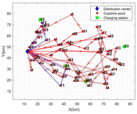 In order to further explore the impact of different distribution modes on the total cost of distribution, path length, power consumption, and distribution time, this paper considers five distribution modes in the study of the multi-model EV vehicle path problem: semi-open multi-distribution centers, closed multi-distribution centers, single distribution centers (no. 0), single distribution centers (no. 1), and single distribution centers (no. 2). Table 6 lists the values of the indicators in different distribution modes, and the values of the parameters are the same as in Table 2. Figure 4, Figure 5, Figure 6 and Figure 7 list the path diagrams of the distribution modes. Among these, TC denotes the total distribution cost (CNY), TD denotes the path length (kilometers), TE denotes the electric energy consumption (kWh), TT denotes the distribution time (minutes), and Ins denotes the improvement (%).