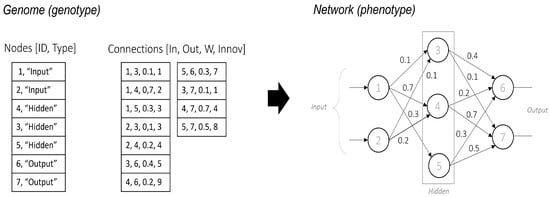 For the neuroevolution of neural networks, we apply the NeuroEvolution of Augmenting Topologies (NEAT) algorithm [25], which evolves Artificial Neural Networks through mutation and selection. The genetic coding scheme represents the neural network in two phases: genotype and phenotype.