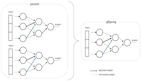 For crossover, modifications were applied to the genome’s information regarding the connections within the neural network. The crossover operator consists of a differential evolution strategy within a neural network framework. It adjusts the network weights based on differences computed from two-parent networks and introduces stochastic mutations while tracking modifications via innovation counters, as illustrated in Figure 3.