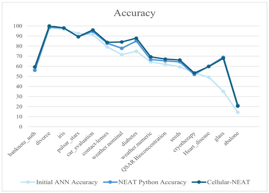 Accuracy comparison of initial ANN, NEAT Python, and Cellular-NEAT proposed algorithms.