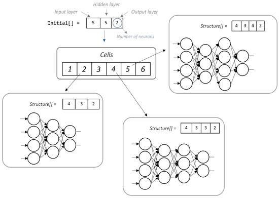 The initial phenotype was used as the basis for the cellular processing algorithm (PCELL) to expand the solution space and improve the algorithm’s performance. At this stage, we employed six processing cells, each receiving the initial phenotype as a parameter. Independently, each cell modified the phenotype by adjusting the number of neurons or the number of layers, as illustrated in Figure 6.