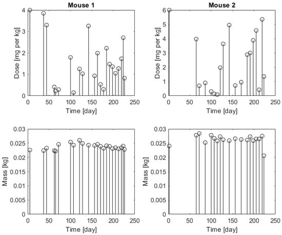 The biological model consists of a mouse mammary tumor model based on the simultaneous inactivation of BRCA1 and p53. In this model, BRCA1, a DNA repair gene, and p53, a regulator of cell cycle and genome stability, are knocked out in breast epithelial cells. The resulting mammary tumors bear a strong resemblance with the BRCA1-linked, triple-negative, hereditary breast cancer in humans: the molecular, immunohistochemical, morphological, and genetic characteristics are almost indistinguishable from their human counterpart []. Moreover, these tumors respond to chemotherapy very similarly: initial treatment with doxorubicin, docetaxel, or cisplatin significantly reduces tumor size and induces remission. However, long-term therapy often fails due to the emergence of drug resistance []. Despite the fact that PLD increases relapse-free and overall survival 6- and 3-fold, respectively, these tumors cannot be cured using conventional chemotherapy regimens []. The ideal therapy is therefore some kind of personalized therapy, tailored to the specific patient. This, however, requires that patient-specific model parameters be known. The mice in the presently reported experiments were genetically identical; thus, similar model parameters were expected. They were implanted with tumor fragments derived from the same tumor []. The first time that the tumor volume reached 200 mm3, the mice received a 4 mg·kg−1 dose of Pegylated Liposomal Doxorubicin. When the tumor started to grow and reached 200 mm3 again, an algorithm-assisted therapy was used and discussed in []. The doses were provided in mg·kg−1 and the injected dose was calculated using the weight of the mouse. Figure 1 shows the dose inputs in mg·kg−1 and the mice’s weights in kg along the experimental time span.