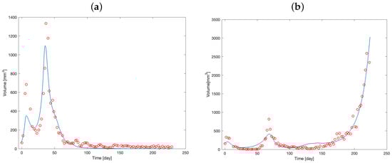 Tumor mass volume of Mouse 1 (a) and Mouse 2 (b). Red circles represent the observed volume over time; blue solid lines represent the model predictions from the optimization procedure.