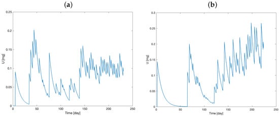 Model prediction of administered therapy dynamics in main compartment (model variable U) for Mouse 1 (a) and Mouse 2 (b).