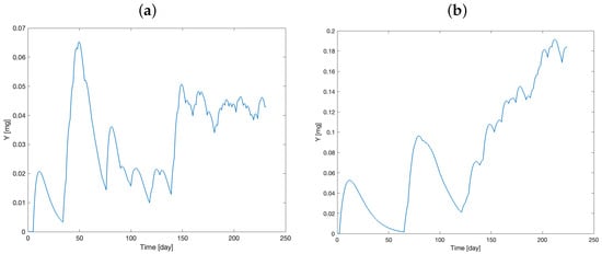 Figure 2a,b, indeed, suggest greater sensitivity to therapy in Mouse 1 than Mouse 2, which appears to develop resistance to the chemotherapy treatment. The similar estimated values for some parameters between the two mice likely result from the experimental design, which used genetically identical mice and implanted them with the same tumor. For example, the transport rate of the drug from the administration compartment to the delay compartment (parameter ), which is likely independent of therapy susceptibility, was estimated to be d] for Mouse 1 and d] for Mouse 2. In contrast, the estimated parameter values for , , , , and  differed substantially between the two mice, reflecting variations in tumor growth and treatment sensitivity. For example,  was approximately twice as high in Mouse 1 as in Mouse 2. A smaller , as observed in Mouse 2, leads to sustained levels of Y (Figure 4), which contributes to therapy resistance (increased Z, Figure 5).