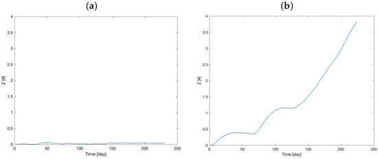 The stability analysis reported above also supports the interpretation that most of the meaningful dynamics of the system depend, in the absence of therapy, on the difference . For computational reasons, boundary values were assigned to all variables. As shown in Figure 7b, the variable reaches its boundary, which is a biologically implausible value. In any case, the result is consistent from a medical point of view, where an untreated tumor tends to increase if the “natural elimination factors” (which in the present modelling approach are summarized by the tumor elimination rate ) do not intervene to stop its growth.