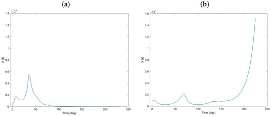 The curves in Figure 6a,b closely resemble the volume behavior, as the volume is directly dependent on the X variable. These figures depict two distinct responses to the therapy, which are consistent with the time courses illustrated in Figure 5a,b. Specifically, these trends highlight the differing rates at which Mouse 1 and Mouse 2 develop resistance to the therapy.