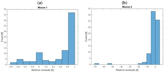 Distribution of relative residuals for Mouse 1 (a) and Mouse 2 (b).