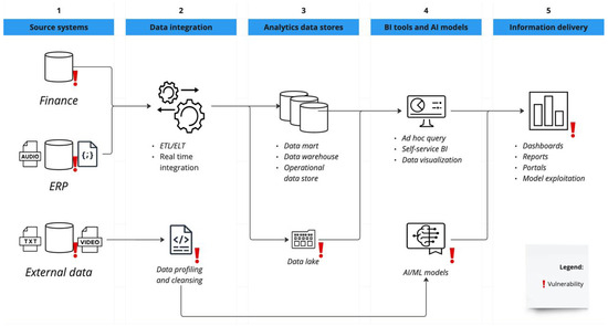 Given that each component in an architecture is susceptible to different types of attack, it is important to clarify the boundaries of the proposed framework. Intrusion detection systems (IDS) [39] are essential components within cybersecurity strategies designed to monitor network or system activities for malicious activities or policy violations. While traditional IDS solutions effectively identify unauthorized activities, integrating a privacy-focused assessment framework can significantly enhance an organization’s overall data protection strategy. Assessing vulnerabilities in data storage layers, as proposed by our methodology, complements IDS capabilities by identifying data sensitivity points that require heightened monitoring and proactive defense mechanisms. The fundamental question to be addressed is what sensitive data can be exposed or maliciously extracted by a potential attacker at each step of the data flow? Most of the processing steps are transient in nature, making the attack window smaller than that of the storage layers. Therefore, we focus the vulnerability assessment framework on persistent layers, as these offer the largest window and the possibility of an attack. In Figure 2, an overview of the vulnerability points is depicted for a data flow from source to delivery of information.