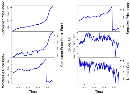 The principal macroeconomic time series dual sets for Pakistan are analyzed in this paper. The dataset includes 79 combined and de-combined variables gathered monthly between 2013 and 2020. The dataset consists of various economic sectors related to Pakistan’s economy, such as the Consumer Price Index (CPI), the Wholesale Price Index (WPI), CPI (Food), Crude Oil, SPI, Natural gas prices, the external sector, real estate, another financial and monetary sector, and the fiscal part, etc. The graphical representation of these variables can be seen in Figure 3. For instance, CPI experienced a sudden rise near 2020, which indicates significant price increases, also known as inflation. The price of consumer goods experienced an expanding trend that abruptly increased due to an economic event during the pandemic. Throughout the graph, the costs of goods and services consistently increase until they reach their peak.