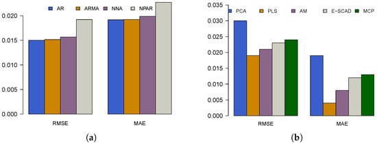 Visualization is another powerful tool for communicating the idea of the greatest technique among a group of techniques, in addition to numbers. Hence, a graphical representation of the RMSE and MAE values for all considered univariate and multivariate forecasting models is plotted in Figure 5. In Figure 5a, the bar plot compares accuracy measures for univariate models, including AR, ARMA, NNA, and NNAR. Theeft side of the plot represents RMSE, while the right side shows MAE. The RMSE values appear relatively similar across models, with minor variations. However, in the MAE comparison, the NPR model exhibits a noticeably higher value, suggesting that it has theeast accurate forecasts among the univariate models. The AR and ARMA models seem to haveower error values, implying better performance in this context. On the other hand, in Figure 5b, the bar plot extends the comparison to multivariate models, including PCA, PLS, AM, E-SCAD, and MCP. The RMSE values vary significantly, with the PCA model exhibiting the highest RMSE, indicating theeast accurate predictions. Conversely, E-SCAD and MCP models display relativelyower RMSE values, suggesting superior performance. The MAE values further confirm this trend, where E-SCAD and MCP again showower error values, while PCA and AM have higher errors, indicatingess accurate predictions. Therefore, again based on graphical assessment (Figure 5), the PLS (FM) model shows superior forecasting compared to univariate and other considered multivariate models.