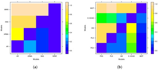 In addition to the above tabulated analysis, the DM test results (p-values) have been plotted in Figure 6. Figure 6 displaysevel plots that illustrate the outcomes of the DM test concerning p-values across various models. These tests are typically employed to assess the accuracy of forecasts between rival predictive models. In Figure 6a, the heatmap depicts p-values for univariate models. The x-axis and y-axis represent an array of univariate models, such as AR, ARMA, NNA, and NNR. The color gradient demonstrates the p-values, where blue shades indicateower p-values (reflecting significant differences in forecasting accuracy), and yellow or beige shades signify higher p-values (indicatingess significant differences or comparable performance among models). Darker blue areas imply that specific models significantly surpass others in forecasting ability. Conversely, Figure 6b broadens this investigation to multivariate models, which include PCA, PLS, AM, E-SCAD, and MCP. The heatmap again portrays the p-values for model comparisons, utilizing a similar color scheme. Green and yellow areas suggest elevated p-values, pointing towards closer performance between models, while blue zones indicateower p-values, suggesting significant variances. The differences in color intensity imply that some models achieve considerably better performance than others while some display similar forecasting capabilities. Therefore, these figures offer a visual depiction of the results from model comparisons, aiding in identifying statistically significant variances in predictive performance. The darker blue areas emphasize where models exhibit the most disparity, while theighter yellow and green regions reflect similar forecasting effectiveness.