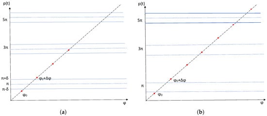 Pseudo-random number generators: The randomness of the decimal digits of has been the most important assumption made in the paper. The ability of irrational numbers to serve as pseudo-random number generators has been the focus of research for many years [], yet this topic remains a big and challenging problem. If we have a rigorous confirmation on the randomness of an irrational number p, an algorithm similar to that presented in the paper can be designed for the number p when a particle performs discrete time motion (1) and (2) along a closed curve of length . On the other hand, if the number p does not have a random sequence of decimal digits, then using it in the problem will result in different properties of the dynamical system (1) and (2). Generating points will not be located randomly and that, in turn, will result in only a limited number of trajectories escaping from the domain (cf. the conclusions for the rational number in this section). Thus, we hope that the results of this paper may spark new interest in research on pseudo-random number generators.