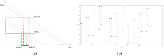 The increment given to the variable in the equation for the straight line produces grid points , along the line , where the point corresponds to and is the step size of the discrete movement of the particle. Those points define the exit through the same channel (i.e., the channel number is fixed) as explained in Section 3. They are shown as black closed circles in Figure 5b.