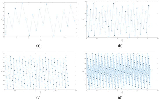 If any and could be used in the definition of , then an infinite grid G would be generated that covers the entire -plane. However, the values of and have to be chosen as explained above due to the requirement that all points on the grid belong to the domain . Increasing the argument , i.e., considering , will result in a grid point outside the domain of definition as . Furthermore, we have for the channel number () in (17), so there are only three points positioned along the line . Also, increasing the argument , i.e., considering , will produce a point that does not belong to the domain of definition as we have . Using the definition (11) gives and we obtain by simple algebraic transformation that