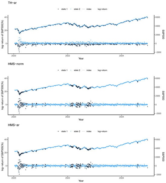 The two-state HMS model (where ) remains a popular specification in financial applications. The two states can usually correspond to depreciation and appreciation regimes. The three-state HMS model () is also used in financial applications. The three states can correspond to three different growth rate phases: recession regime, medium growth regime, and high growth regime, as described in [44,45].