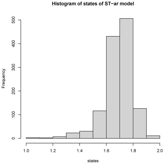 We consider the AR(1) model (Equation (3) with ) as a simple state-dependent example with the number of states being . The smooth transition autoregressive (STAR) model is given as follows: