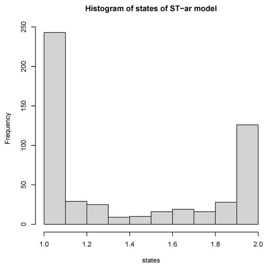 Teräsvirta [7] and Eitrheim and Teräsvirta [65] first introduced and discussed the smooth transition (ST) model and related procedures. The autoregressive model that allows for regime switching in Equation (3) can also be viewed as