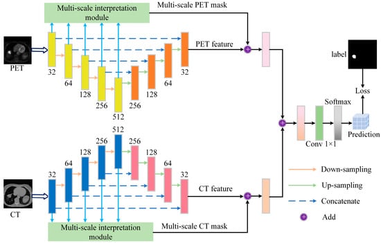 In recent years, deep learning techniques have made significant progress in the field of medical image analysis. By training large neural networks, deep learning models are able to automatically learn and extract complex features from images, achieving high-accuracy image classification, detection, and segmentation. In particular, the UNet model based on convolutional neural networks (CNNs) and its variants have achieved remarkable success in medical image segmentation tasks [8]. However, when dealing with multimodal images such as PET-CT, the UNet model still faces some challenges. The standard UNet model, with its symmetric encoder-decoder structure, can effectively capture multi-scale features in images, but it still struggles to fully utilize the complementary information between PET and CT images. Traditional multimodal processing methods typically handle each modality independently or perform simple fusion at the feature or decision level [9]. This approach limits the effective use of complementary information between PET and CT images, impacting the precision and consistency of segmentation results. Furthermore, in practical applications, model interpretability is a critical issue, particularly in clinical settings. Clinicians need to understand the reasoning behind the model’s decisions to ensure its reliability and safety. However, deep learning models are often seen as “black boxes”, especially when fusing multimodal images, because of a lack of transparency [10,11]. Improving model interpretability and making the decision-making process more transparent is an important direction for enhancing the clinical application value of deep learning models. To address these challenges, this study proposes a tumor segmentation method based on a multi-scale interpretability approach. By integrating a multi-scale interpretative mask generation mechanism, we have designed a multi-scale interpretability module (MSIM) aimed at improving both the precision and interpretability of PET-CT image tumor segmentation. This module extracts and integrates complementary information from both PET and CT images across different scales, significantly enhancing the segmentation accuracy of tumor regions while providing clear decision-making support for clinicians. Additionally, the design of an interpretability loss function further enhances the model’s focus on key features during training, boosting its interpretability.