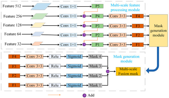 The MSIM is a core component of the tumor segmentation model and is designed to effectively integrate multimodal PET and CT information to improve segmentation accuracy and enhance model interpretability. The module consists of the multi-scale feature processing module and the mask generation module. First, the multi-scale feature maps extracted during the UNet down-sampling process are input into the multi-scale feature processing module. This module processes features at different scales to ensure effective information fusion. Next, the mask generation module uses a specific mask mechanism to generate interpretive masks that emphasize critical areas for tumor segmentation. Finally, the masks at multiple scales are fused through weighted integration to generate the final multi-scale fusion mask, which guides the model to achieve more accurate segmentation predictions. The structure of the MSIM is shown in Figure 3.