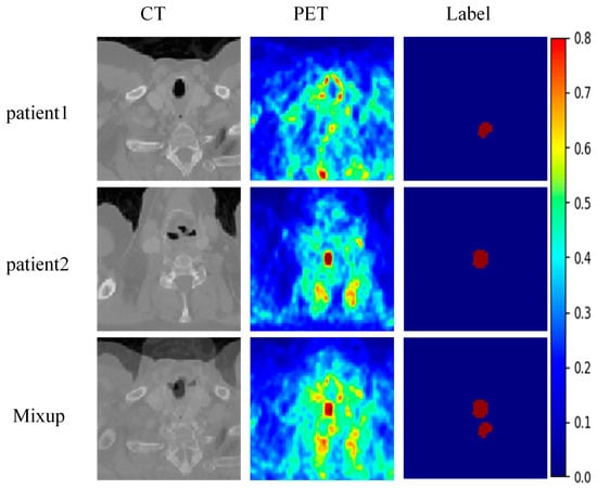 Cancer has long been one of the major challenges in the history of medicine. According to the 2024 global cancer statistics published by the International Agency for Research on Cancer (IARC) for 2022 [1], there were approximately 20 million new cancer cases and 9.7 million cancer-related deaths worldwide. Medical imaging plays a critical role in clinical diagnosis and treatment, particularly in tumor detection and assessment. Accurate tumor localization and segmentation not only enhance clinical decision-making but also enable personalized treatment planning for patients. Positron emission tomography (PET) and computed tomography (CT) are two commonly used imaging techniques that are widely applied in tumor diagnosis and monitoring. PET detects metabolic activity by imaging radiotracers, such as 18F-FDG, injected into the body, identifying active tumor tissue [2]. Due to their higher metabolic activity, tumor regions often exhibit higher standardized uptake values (SUV) on PET images, contrasting with surrounding normal tissue [3,4], as shown in Figure 1b. CT provides high-resolution anatomical structural information, clearly showing tumors and their surrounding anatomical details, as shown in Figure 1a. However, using PET or CT images alone for tumor segmentation has limitations: PET imaging suffers from low spatial resolution and issues such as blurred boundaries and uneven intensity, while CT images have poor contrast between lesions and normal tissues, making it difficult to fully capture the pathological features of tumors. Therefore, combining PET and CT images to leverage the strengths of both modalities has proven to be an effective way to improve tumor segmentation accuracy and reliability [5,6,7].