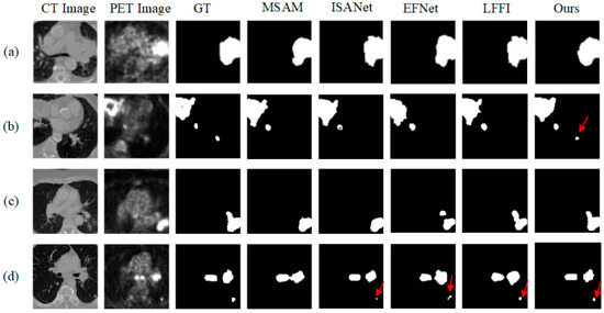 On the Lymphoma dataset, our method continued to outperform the other methods, achieving a DSC of 83.18% and an HD of 20.6478 while also reducing VOE to 18.89%. These results demonstrate the method’s ability to segment complex structures accurately. The results for the Lung cancer dataset further support this conclusion, with our method reaching a DSC of 84.80% and significantly reducing CE, VE, and VOE, indicating that it effectively reduces segmentation errors and ensures the accuracy and consistency of the results. Figure 5 provides visual examples of segmentation results on the Lung cancer dataset using different segmentation methods. The visual results show that our method excels in tumor recognition and segmentation. In comparison, methods such as MSAM, ISANet, EFNet, and LFFI, while able to detect the main lesion areas in some cases, exhibit certain shortcomings in boundary processing and detail preservation. For example, in the first row, other methods show noticeable under-segmentation or mis-segmentation at the lesion edges, whereas our method aligns better with the ground truth (GT). In the second and third rows, where the lesion areas are more complex and include smaller lesions, our method again demonstrates its ability to capture these intricate structures, especially excelling in the segmentation of small lesions, avoiding both over-segmentation and missed detection. In contrast, EFNet and LFFI show insufficient recognition capabilities for small lesions in these scenarios, leading to more under-segmentation and artifacts in their outputs. The case in the fourth row further validates the robustness of our method in complex scenarios. The lesion area in this image has an irregular shape, and the contrast in both CT and PET images is relatively low, which increases the difficulty of segmentation. Despite these challenges, our method still accurately segments the lesion area and maintains high precision in boundary processing.