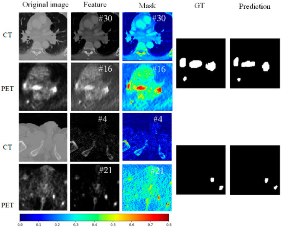 The fourth row shows the corresponding PET image slice. The original image demonstrates the distribution of metabolic activity. The feature map captures the areas of high metabolic activity within the PET image. The mask highlights these critical regions, underscoring their importance to the segmentation result. The comparison of the ground truth and the model’s predictions further validates the model’s predictive ability, showing that it accurately identifies tumor regions across different slices in PET images.